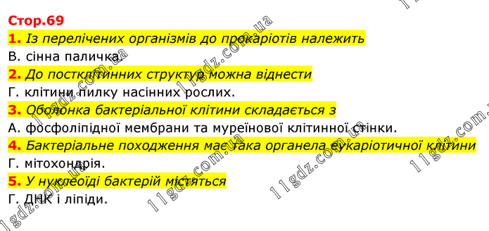 1. Із перелічених організмів до прокаріотів належить В. сінна паличка. 2. До постклітинних структур можна віднести Г. клітини пилку насінних рослих. 3. Оболонка бактеріальної клітини складається з А. фосфоліпідної мембрани та муреїнової клітинної стінки. 4. Бактеріальне походження має така органела еукаріотичної клітини Г. мітохондрія. 5. У нуклеоїді бактерій містяться Г. ДНК і ліпіди.