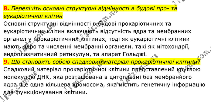 8. Перелічіть основні структурні відмінності в будові про- та еукаріотичної клітин Основні структурні відмінності в будові прокаріотичних та еукаріотичних клітин включають відсутність ядра та мембранних органел у прокаріотичних клітинах, тоді як еукаріотичні клітини мають ядро та численні мембранні органели, такі як мітохондрії, ендоплазматичний ретикулум, та апарат Гольджі. 9. Що становить собою спадковий матеріал прокаріотичної клітини? Спадковий матеріал прокаріотичної клітини представлений круглою молекулою ДНК, яка розташована в цитоплазмі без мембранного ядра. Це одна кільцева хромосома, яка містить генетичну інформацію для функціонування клітини.