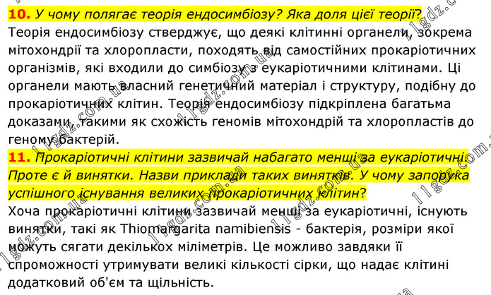 10. У чому полягає теорія ендосимбіозу? Яка доля цієї теорії? Теорія ендосимбіозу стверджує, що деякі клітинні органели, зокрема мітохондрії та хлоропласти, походять від самостійних прокаріотичних організмів, які входили до симбіозу з еукаріотичними клітинами. Ці органели мають власний генетичний матеріал і структуру, подібну до прокаріотичних клітин. Теорія ендосимбіозу підкріплена багатьма доказами, такими як схожість геномів мітохондрій та хлоропластів до геному бактерій. 11. Прокаріотичні клітини зазвичай набагато менші за еукаріотичні. Проте є й винятки. Назви приклади таких винятків. У чому запорука успішного існування великих прокаріотичних клітин? Хоча прокаріотичні клітини зазвичай менші за еукаріотичні, існують винятки, такі як Thiomargarita namibiensis - бактерія, розміри якої можуть сягати декількох міліметрів. Це можливо завдяки її спроможності утримувати великі кількості сірки, що надає клітині додатковий об'єм та щільність.