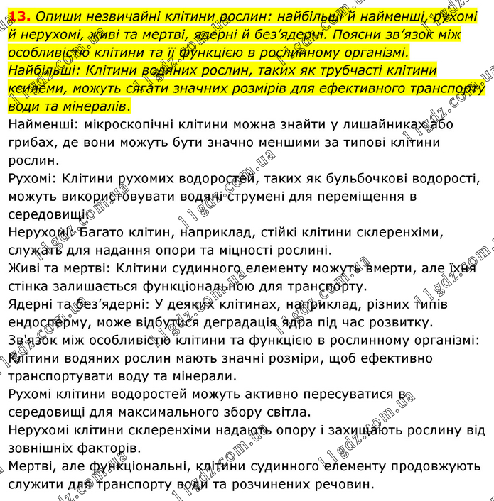 Опиши незвичайні клітини рослин: найбільші й найменші, рухомі й нерухомі, живі та мертві, ядерні й без’ядерні. Поясни зв’язок між особливістю клітини та її функцією в рослинному організмі. Найбільші: Клітини водяних рослин, таких як трубчасті клітини ксилеми, можуть сягати значних розмірів для ефективного транспорту води та мінералів. Найменші: мікроскопічні клітини можна знайти у лишайниках або грибах, де вони можуть бути значно меншими за типові клітини рослин. Рухомі: Клітини рухомих водоростей, таких як бульбочкові водорості, можуть використовувати водяні струмені для переміщення в середовищі. Нерухомі: Багато клітин, наприклад, стійкі клітини склеренхіми, служать для надання опори та міцності рослині. Живі та мертві: Клітини судинного елементу можуть вмерти, але їхня стінка залишається функціональною для транспорту. Ядерні та без’ядерні: У деяких клітинах, наприклад, різних типів ендосперму, може відбутися деградація ядра під час розвитку. Зв'язок між особливістю клітини та функцією в рослинному організмі: Клітини водяних рослин мають значні розміри, щоб ефективно транспортувати воду та мінерали. Рухомі клітини водоростей можуть активно пересуватися в середовищі для максимального збору світла. Нерухомі клітини склеренхіми надають опору і захищають рослину від зовнішніх факторів. Мертві, але функціональні, клітини судинного елементу продовжують служити для транспорту води та розчинених речовин.