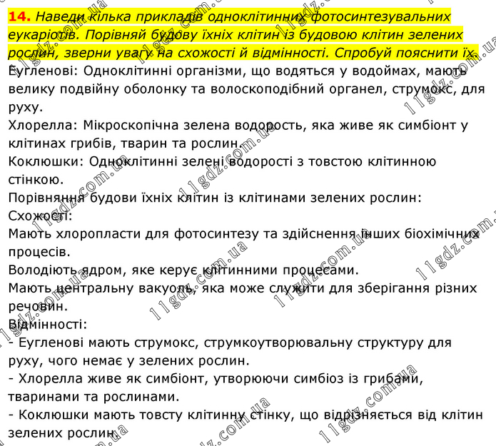 Наведи кілька прикладів одноклітинних фотосинтезувальних еукаріотів. Порівняй будову їхніх клітин із будовою клітин зелених рослин, зверни увагу на схожості й відмінності. Спробуй пояснити їх. Еугленові: Одноклітинні організми, що водяться у водоймах, мають велику подвійну оболонку та волоскоподібний органел, струмокс, для руху. Хлорелла: Мікроскопічна зелена водорость, яка живе як симбіонт у клітинах грибів, тварин та рослин. Коклюшки: Одноклітинні зелені водорості з товстою клітинною стінкою. Порівняння будови їхніх клітин із клітинами зелених рослин: Схожості: Мають хлоропласти для фотосинтезу та здійснення інших біохімічних процесів. Володіють ядром, яке керує клітинними процесами. Мають центральну вакуоль, яка може служити для зберігання різних речовин. Відмінності: - Еугленові мають струмокс, струмкоутворювальну структуру для руху, чого немає у зелених рослин. - Хлорелла живе як симбіонт, утворюючи симбіоз із грибами, тваринами та рослинами. - Коклюшки мають товсту клітинну стінку, що відрізняється від клітин зелених рослин.