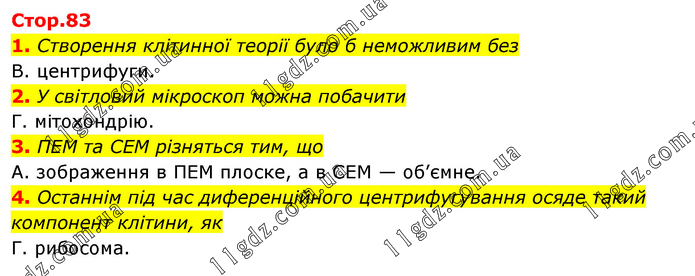 1. Створення клітинної теорії було б неможливим без В. центрифуги. 2. У світловий мікроскоп можна побачити Г. мітохондрію. 3. ПЕМ та СЕМ різняться тим, що А. зображення в ПЕМ плоске, а в СЕМ — об’ємне. 4. Останнім під час диференційного центрифугування осяде такий компонент клітини, як Г. рибосома.