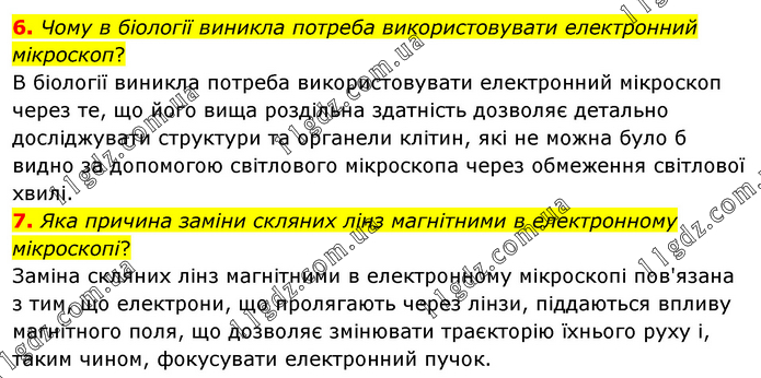 6. Чому в біології виникла потреба використовувати електронний мікроскоп? В біології виникла потреба використовувати електронний мікроскоп через те, що його вища роздільна здатність дозволяє детально досліджувати структури та органели клітин, які не можна було б видно за допомогою світлового мікроскопа через обмеження світлової хвилі. 7. Яка причина заміни скляних лінз магнітними в електронному мікроскопі? Заміна скляних лінз магнітними в електронному мікроскопі пов'язана з тим, що електрони, що пролягають через лінзи, піддаються впливу магнітного поля, що дозволяє змінювати траєкторію їхнього руху і, таким чином, фокусувати електронний пучок.