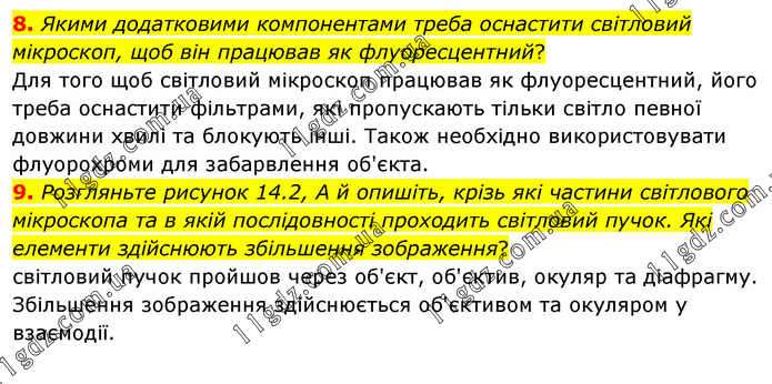 8. Якими додатковими компонентами треба оснастити світловий мікроскоп, щоб він працював як флуоресцентний? Для того щоб світловий мікроскоп працював як флуоресцентний, його треба оснастити фільтрами, які пропускають тільки світло певної довжини хвилі та блокують інші. Також необхідно використовувати флуорохроми для забарвлення об'єкта. 9. Розгляньте рисунок 14.2, А й опишіть, крізь які частини світлового мікроскопа та в якій послідовності проходить світловий пучок. Які елементи здійснюють збільшення зображення? світловий пучок пройшов через об'єкт, об'єктив, окуляр та діафрагму. Збільшення зображення здійснюється об'єктивом та окуляром у взаємодії.