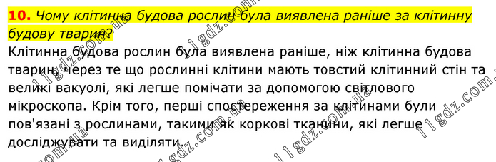 Чому клітинна будова рослин була виявлена раніше за клітинну будову тварин? Клітинна будова рослин була виявлена раніше, ніж клітинна будова тварин, через те що рослинні клітини мають товстий клітинний стін та великі вакуолі, які легше помічати за допомогою світлового мікроскопа. Крім того, перші спостереження за клітинами були пов'язані з рослинами, такими як коркові тканини, які легше досліджувати та виділяти.