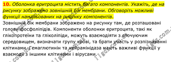 Оболонка еритроцита містить багато компонентів. Укажіть, де на рисунку зображено зовнішній бік мембрани. Обговоріть можливі функції намальованих на рисунку компонентів. Зовнішній бік мембрани зображено на рисунку там, де розташовані голови фосфоліпідів. Компоненти оболонки еритроцита, такі як глікопротеїни та гліколіпіди, можуть взаємодіяти з оточуючим середовищем, визначати групу крові, та брати участь у розпізнаванні клітинами. Гемаглютинін та нейрамінідаза мають важливі функції у взаємодії з іншими клітинами і вірусами.