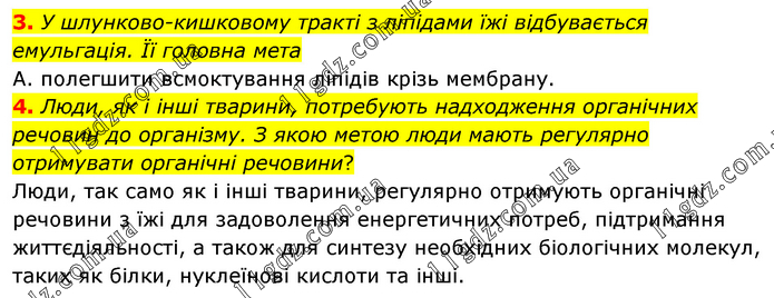 3. У шлунково-кишковому тракті з ліпідами їжі відбувається емульгація. Її головна мета А. полегшити всмоктування ліпідів крізь мембрану. 4. Люди, як і інші тварини, потребують надходження органічних речовин до організму. З якою метою люди мають регулярно отримувати органічні речовини? Люди, так само як і інші тварини, регулярно отримують органічні речовини з їжі для задоволення енергетичних потреб, підтримання життєдіяльності, а також для синтезу необхідних біологічних молекул, таких як білки, нуклеїнові кислоти та інші.