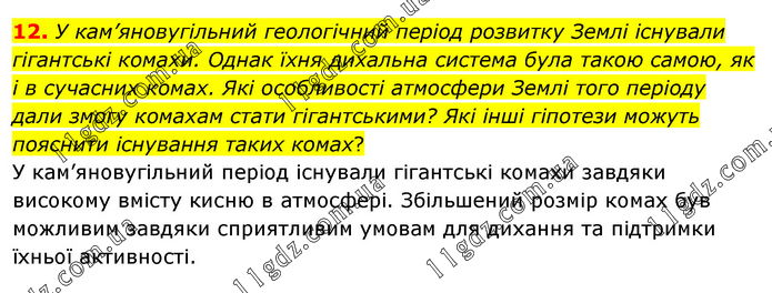 У кам’яновугільний геологічний період розвитку Землі існували гігантські комахи. Однак їхня дихальна система була такою самою, як і в сучасних комах. Які особливості атмосфери Землі того періоду дали змогу комахам стати гігантськими? Які інші гіпотези можуть пояснити існування таких комах? У кам’яновугільний період існували гігантські комахи завдяки високому вмісту кисню в атмосфері. Збільшений розмір комах був можливим завдяки сприятливим умовам для дихання та підтримки їхньої активності.