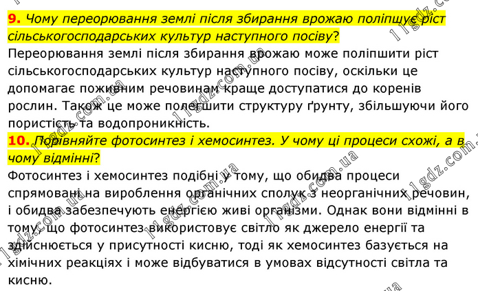 9. Чому переорювання землі після збирання врожаю поліпшує ріст сільськогосподарських культур наступного посіву? Переорювання землі після збирання врожаю може поліпшити ріст сільськогосподарських культур наступного посіву, оскільки це допомагає поживним речовинам краще доступатися до коренів рослин. Також це може полегшити структуру ґрунту, збільшуючи його пористість та водопроникність. 10. Порівняйте фотосинтез і хемосинтез. У чому ці процеси схожі, а в чому відмінні? Фотосинтез і хемосинтез подібні у тому, що обидва процеси спрямовані на вироблення органічних сполук з неорганічних речовин, і обидва забезпечують енергією живі організми. Однак вони відмінні в тому, що фотосинтез використовує світло як джерело енергії та здійснюється у присутності кисню, тоді як хемосинтез базується на хімічних реакціях і може відбуватися в умовах відсутності світла та кисню.
