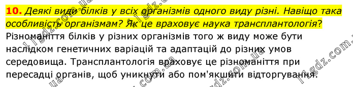 Деякі види білків у всіх організмів одного виду різні. Навіщо така особливість організмам? Як це враховує наука трансплантологія? Різноманіття білків у різних організмів того ж виду може бути наслідком генетичних варіацій та адаптацій до різних умов середовища. Трансплантологія враховує це різноманіття при пересадці органів, щоб уникнути або пом'якшити відторгування.