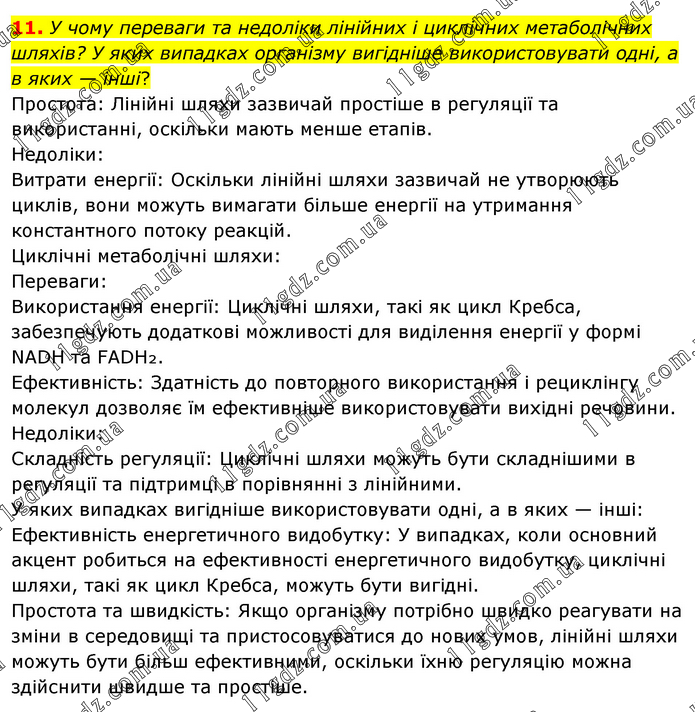 У чому переваги та недоліки лінійних і циклічних метаболічних шляхів? У яких випадках організму вигідніше використовувати одні, а в яких — інші? Простота: Лінійні шляхи зазвичай простіше в регуляції та використанні, оскільки мають менше етапів. Недоліки: Витрати енергії: Оскільки лінійні шляхи зазвичай не утворюють циклів, вони можуть вимагати більше енергії на утримання константного потоку реакцій. Циклічні метаболічні шляхи: Переваги: Використання енергії: Циклічні шляхи, такі як цикл Кребса, забезпечують додаткові можливості для виділення енергії у формі NADH та FADH₂. Ефективність: Здатність до повторного використання і рециклінгу молекул дозволяє їм ефективніше використовувати вихідні речовини. Недоліки: Складність регуляції: Циклічні шляхи можуть бути складнішими в регуляції та підтримці в порівнянні з лінійними. У яких випадках вигідніше використовувати одні, а в яких — інші: Ефективність енергетичного видобутку: У випадках, коли основний акцент робиться на ефективності енергетичного видобутку, циклічні шляхи, такі як цикл Кребса, можуть бути вигідні. Простота та швидкість: Якщо організму потрібно швидко реагувати на зміни в середовищі та пристосовуватися до нових умов, лінійні шляхи можуть бути більш ефективними, оскільки їхню регуляцію можна здійснити швидше та простіше.