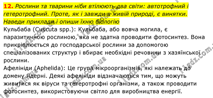 Рослини та тварини ніби втілюють два світи: автотрофний і гетеротрофний. Проте, як і завжди в живій природі, є винятки. Наведи приклади і опиши їхню біологію Кульбаба (Cuscuta spp.): Кульбаба, або вовча могила, є паразитичною рослиною, яка не здатна проводити фотосинтез. Вона прикріплюється до господарської рослини за допомогою спеціалізованих структур і вбирає необхідні речовини з хазяїнської рослини. Афелініди (Aphelida): Це група мікроорганізмів, які належать до домену Ядерні. Деякі афелініди відзначаються тим, що можуть живитися як віруси та гетеротрофні організми, а також проводити фотосинтез, використовуючи світло для виробництва енергії.