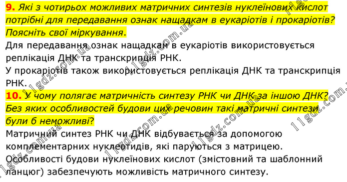 9. Які з чотирьох можливих матричних синтезів нуклеїнових кислот потрібні для передавання ознак нащадкам в еукаріотів і прокаріотів? Поясніть свої міркування. Для передавання ознак нащадкам в еукаріотів використовується реплікація ДНК та транскрипція РНК. У прокаріотів також використовується реплікація ДНК та транскрипція РНК. 10. У чому полягає матричність синтезу РНК чи ДНК за іншою ДНК? Без яких особливостей будови цих речовин такі матричні синтези були б неможливі? Матричний синтез РНК чи ДНК відбувається за допомогою комплементарних нуклеотидів, які паруються з матрицею. Особливості будови нуклеїнових кислот (змістовний та шаблонний ланцюг) забезпечують можливість матричного синтезу.