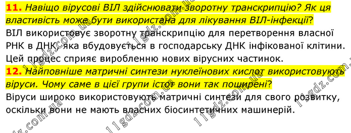 11. Навіщо вірусові ВІЛ здійснювати зворотну транскрипцію? Як ця властивість може бути використана для лікування ВІЛ-інфекції? ВІЛ використовує зворотну транскрипцію для перетворення власної РНК в ДНК, яка вбудовується в господарську ДНК інфікованої клітини. Цей процес сприяє виробленню нових вірусних частинок. 12. Найповніше матричні синтези нуклеїнових кислот використовують віруси. Чому саме в цієї групи істот вони так поширені? Віруси широко використовують матричні синтези для свого розвитку, оскільки вони не мають власних біосинтетичних машинерій.