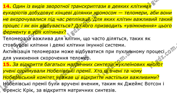 14. Один із видів зворотної транскриптази в деяких клітинах еукаріотів добудовує кінцеві ділянки хромосом — теломери, аби вони не вкорочувалися під час реплікації. Для яких клітин важливий такий процес і як він відбувається? До чого призводить «увімкнення» цього ферменту в усіх клітинах? Теломераза важлива для клітин, що часто діляться, таких як стовбурові клітини і деякі клітини імунної системи. Активізація теломерази може відбуватися при пухлинному процесі для уникнення скорочення теломер. 15. За відкриття багатьох матричних синтезів нуклеїнових кислот учені отримували Нобелівські премії. Хто ці вчені та чому Нобелівський комітет уважав ці відкриття настільки важливими? Нобелівські премії були вручені вченим, таким як Джеймс Вотсон і Френсіс Крік, за відкриття матричних синтезів.
