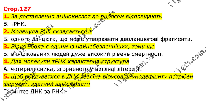 1. За доставлення амінокислот до рибосом відповідають Б. тРНК. 2. Молекула РНК складається з Б. одного ланцюга, що може утворювати дволанцюгові фрагменти. 3. Вірус Ебола є одним із найнебезпечніших, тому що Б. в інфікованих людей дуже високий рівень смертності. 4. Для молекули тРНК характерна структура А. чотирилисника, згорненого у вигляді літери Т. 5. Щоб вбудуватися в ДНК хазяїна вірусові імунодефіциту потрібен фермент, здатний здійснювати Г. синтез ДНК за РНК.
