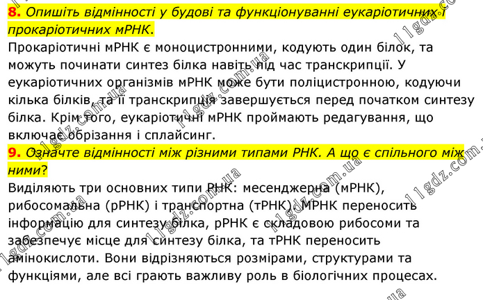 8. Опишіть відмінності у будові та функціонуванні еукаріотичних і прокаріотичних мРНК. Прокаріотичні мРНК є моноцистронними, кодують один білок, та можуть починати синтез білка навіть під час транскрипції. У еукаріотичних організмів мРНК може бути поліцистронною, кодуючи кілька білків, та її транскрипція завершується перед початком синтезу білка. Крім того, еукаріотичні мРНК проймають редагування, що включає обрізання і сплайсинг. 9. Означте відмінності між різними типами РНК. А що є спільного між ними? Виділяють три основних типи РНК: месенджерна (мРНК), рибосомальна (рРНК) і транспортна (тРНК). МРНК переносить інформацію для синтезу білка, рРНК є складовою рибосоми та забезпечує місце для синтезу білка, та тРНК переносить амінокислоти. Вони відрізняються розмірами, структурами та функціями, але всі грають важливу роль в біологічних процесах.