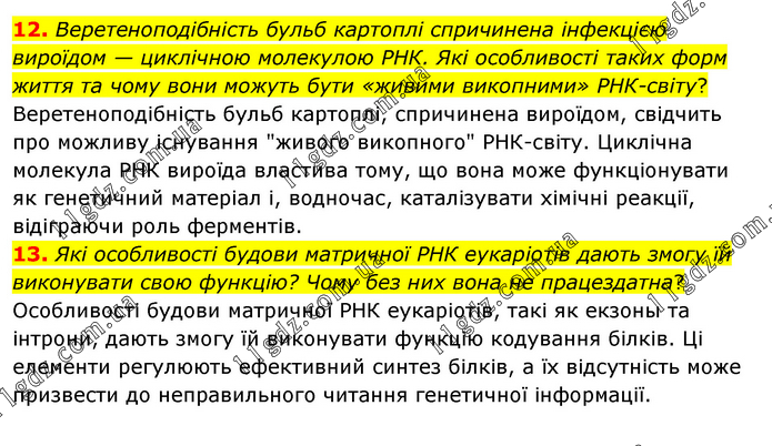 12. Веретеноподібність бульб картоплі спричинена інфекцією вироїдом — циклічною молекулою РНК. Які особливості таких форм життя та чому вони можуть бути «живими викопними» РНК-світу? Веретеноподібність бульб картоплі, спричинена вироїдом, свідчить про можливу існування "живого викопного" РНК-світу. Циклічна молекула РНК вироїда властива тому, що вона може функціонувати як генетичний матеріал і, водночас, каталізувати хімічні реакції, відіграючи роль ферментів. 13. Які особливості будови матричної РНК еукаріотів дають змогу їй виконувати свою функцію? Чому без них вона не працездатна? Особливості будови матричної РНК еукаріотів, такі як екзоны та інтрони, дають змогу їй виконувати функцію кодування білків. Ці елементи регулюють ефективний синтез білків, а їх відсутність може призвести до неправильного читання генетичної інформації.