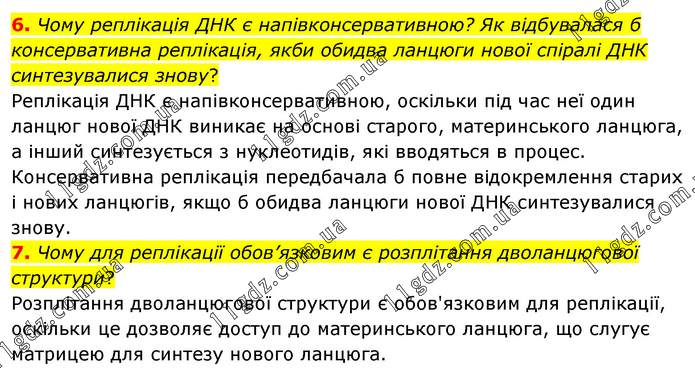 6. Чому реплікація ДНК є напівконсервативною? Як відбувалася б консервативна реплікація, якби обидва ланцюги нової спіралі ДНК синтезувалися знову? Реплікація ДНК є напівконсервативною, оскільки під час неї один ланцюг нової ДНК виникає на основі старого, материнського ланцюга, а інший синтезується з нуклеотидів, які вводяться в процес. Консервативна реплікація передбачала б повне відокремлення старих і нових ланцюгів, якщо б обидва ланцюги нової ДНК синтезувалися знову. 7. Чому для реплікації обов’язковим є розплітання дволанцюгової структури? Розплітання дволанцюгової структури є обов'язковим для реплікації, оскільки це дозволяє доступ до материнського ланцюга, що слугує матрицею для синтезу нового ланцюга.