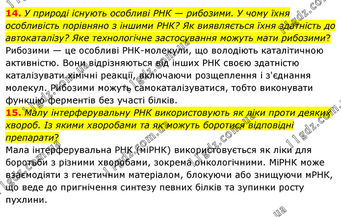14. У природі існують особливі РНК — рибозими. У чому їхня особливість порівняно з іншими РНК? Як виявляється їхня здатність до автокаталізу? Яке технологічне застосування можуть мати рибозими? Рибозими — це особливі РНК-молекули, що володіють каталітичною активністю. Вони відрізняються від інших РНК своєю здатністю каталізувати хімічні реакції, включаючи розщеплення і з'єднання молекул. Рибозими можуть самокаталізуватися, тобто виконувати функцію ферментів без участі білків. 15. Малу інтерферувальну РНК використовують як ліки проти деяких хвороб. Із якими хворобами та як можуть боротися відповідні препарати? Мала інтерферувальна РНК (міРНК) використовується як ліки для боротьби з різними хворобами, зокрема онкологічними. МіРНК може взаємодіяти з генетичним матеріалом, блокуючи або знищуючи мРНК, що веде до пригнічення синтезу певних білків та зупинки росту пухлини.