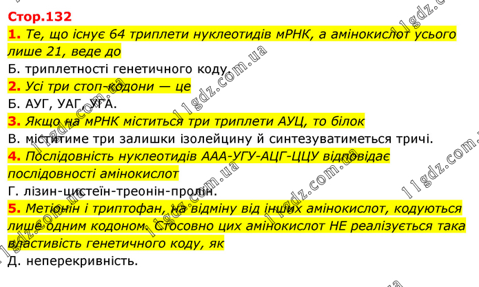 1. Те, що існує 64 триплети нуклеотидів мРНК, а амінокислот усього лише 21, веде до Б. триплетності генетичного коду. 2. Усі три стоп-кодони — це Б. АУГ, УАГ, УГА. 3. Якщо на мРНК міститься три триплети АУЦ, то білок В. міститиме три залишки ізолейцину й синтезуватиметься тричі. 4. Послідовність нуклеотидів ААА-УГУ-АЦГ-ЦЦУ відповідає послідовності амінокислот Г. лізин-цистеїн-треонін-пролін. 5. Метіонін і триптофан, на відміну від інших амінокислот, кодуються лише одним кодоном. Стосовно цих амінокислот НЕ реалізується така властивість генетичного коду, як Д. неперекривність.
