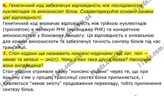 6. Генетичний код забезпечує відповідність між послідовністю нуклеотидів та амінокислот білка. Схарактеризуйте основні ознаки цієї відповідності. Генетичний код визначає відповідність між трійкою нуклеотидів (триплетом) в молекулі РНК (месенджер РНК) та конкретною амінокислотою у білковому ланцюгу. Ця відповідність є унікальною для кожної амінокислоти та забезпечує точність синтезу білків під час трансляції. 7. Стоп-кодони ще називають нонсенс-кодонами (від лат. non — немає та sensus — зміст). Чому в них така друга назва? Наскільки вона виправдана? Стоп-кодони отримали назву "нoнсенс-кодони" через те, що при їхньому з'яві у процесі трансляції синтез білка припиняється, і з'являється "немає змісту" продовження перекладу, тобто припинення синтезу білка.