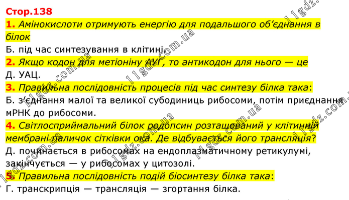 1. Амінокислоти отримують енергію для подальшого об’єднання в білок Б. під час синтезування в клітині. 2. Якщо кодон для метіоніну АУГ, то антикодон для нього — це Д. УАЦ. 3. Правильна послідовність процесів під час синтезу білка така: Б. з’єднання малої та великої субодиниць рибосоми, потім приєднання мРНК до рибосоми. 4. Світлосприймальний білок родопсин розташований у клітинній мембрані паличок сітківки ока. Де відбувається його трансляція? Д. починається в рибосомах на ендоплазматичному ретикулумі, закінчується — у рибосомах у цитозолі. 5. Правильна послідовність подій біосинтезу білка така: Г. транскрипція — трансляція — згортання білка.