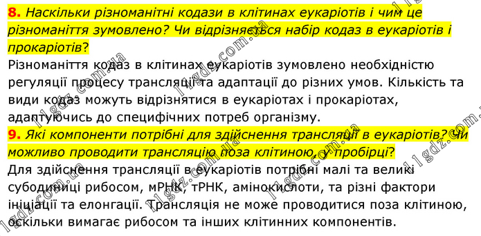 8. Наскільки різноманітні кодази в клітинах еукаріотів і чим це різноманіття зумовлено? Чи відрізняється набір кодаз в еукаріотів і прокаріотів? Різноманіття кодаз в клітинах еукаріотів зумовлено необхідністю регуляції процесу трансляції та адаптації до різних умов. Кількість та види кодаз можуть відрізнятися в еукаріотах і прокаріотах, адаптуючись до специфічних потреб організму. 9. Які компоненти потрібні для здійснення трансляції в еукаріотів? Чи можливо проводити трансляцію поза клітиною, у пробірці? Для здійснення трансляції в еукаріотів потрібні малі та великі субодиниці рибосом, мРНК, тРНК, амінокислоти, та різні фактори ініціації та елонгації. Трансляція не може проводитися поза клітиною, оскільки вимагає рибосом та інших клітинних компонентів.
