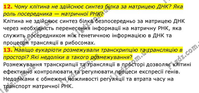 12. Чому клітина не здійснює синтез білка за матрицею ДНК? Яка роль посередника — матричної РНК? Клітина не здійснює синтез білка безпосередньо за матрицею ДНК через необхідність перенесення інформації на матричну РНК, яка служить посередником між генетичною інформацією в ДНК та процесом трансляції в рибосомах. 13. Навіщо еукаріоти розмежували транскрипцію та трансляцію в просторі? Які недоліки в такого розмежування? Розмежування транскрипції та трансляції в просторі дозволяє клітині ефективно контролювати та регулювати процеси експресії генів. Недоліками є обмежені можливості регуляції та втрата часу на транспорт матричної РНК.