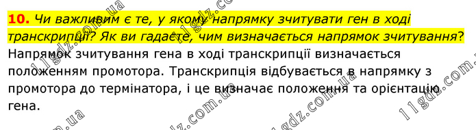 Чи важливим є те, у якому напрямку зчитувати ген в ході транскрипції? Як ви гадаєте, чим визначається напрямок зчитування? Напрямок зчитування гена в ході транскрипції визначається положенням промотора. Транскрипція відбувається в напрямку з промотора до термінатора, і це визначає положення та орієнтацію гена.