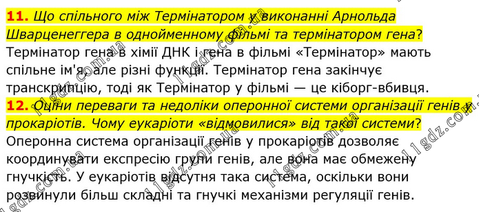 11. Що спільного між Термінатором у виконанні Арнольда Шварценеггера в однойменному фільмі та термінатором гена? Термінатор гена в хімії ДНК і гена в фільмі «Термінатор» мають спільне ім'я, але різні функції. Термінатор гена закінчує транскрипцію, тоді як Термінатор у фільмі — це кіборг-вбивця. 12. Оціни переваги та недоліки оперонної системи організації генів у прокаріотів. Чому еукаріоти «відмовилися» від такої системи? Оперонна система організації генів у прокаріотів дозволяє координувати експресію групи генів, але вона має обмежену гнучкість. У еукаріотів відсутня така система, оскільки вони розвинули більш складні та гнучкі механізми регуляції генів.