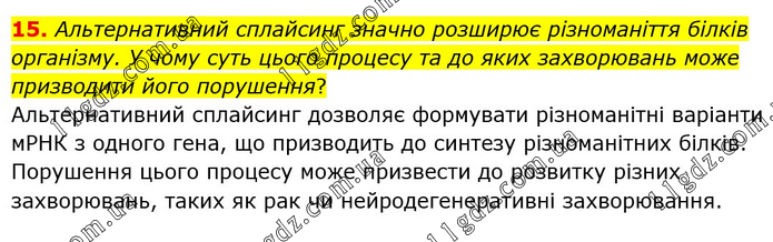 Альтернативний сплайсинг значно розширює різноманіття білків організму. У чому суть цього процесу та до яких захворювань може призводити його порушення? Альтернативний сплайсинг дозволяє формувати різноманітні варіанти мРНК з одного гена, що призводить до синтезу різноманітних білків. Порушення цього процесу може призвести до розвитку різних захворювань, таких як рак чи нейродегенеративні захворювання.
