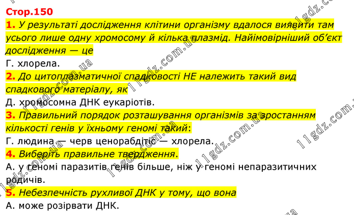 1. У результаті дослідження клітини організму вдалося виявити там усього лише одну хромосому й кілька плазмід. Найімовірніший об’єкт дослідження — це Г. хлорела. 2. До цитоплазматичної спадковості НЕ належить такий вид спадкового матеріалу, як Д. хромосомна ДНК еукаріотів. 3. Правильний порядок розташування організмів за зростанням кількості генів у їхньому геномі такий: Г. людина — черв ценорабдітіс — хлорела. 4. Виберіть правильне твердження. А. у геномі паразитів генів більше, ніж у геномі непаразитичних родичів. 5. Небезпечність рухливої ДНК у тому, що вона А. може розірвати ДНК.