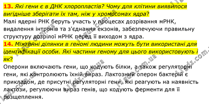 13. Які гени є в ДНК хлоропластів? Чому для клітини виявилося вигідніше зберігати їх там, ніж у хромосомах ядра? Малі ядерні РНК беруть участь у процесах дозрівання мРНК, видалення інтронів та з'єднання екзонів, забезпечуючи правильну структуру дозрілої мРНК перед її виходом з ядра. 14. Міжгенні ділянки в геномі людини можуть бути використані для ідентифікації особи. Які частини геному для цього використовують і як? Оперони включають гени, що кодують білки, а також регуляторні гени, які контролюють їхній вираз. Лактозний оперон бактерій є прикладом, де присутні регуляторні гени, які реагують на наявність лактози, регулюючи вираз генів, що кодують ферменти для її розщеплення.