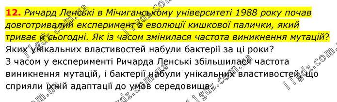 Ричард Ленські в Мічиганському університеті 1988 року почав довготривалий експеримент з еволюції кишкової палички, який триває й сьогодні. Як із часом змінилася частота виникнення мутацій? Яких унікальних властивостей набули бактерії за ці роки? З часом у експерименті Ричарда Ленські збільшилася частота виникнення мутацій, і бактерії набули унікальних властивостей, що сприяли їхній адаптації до умов середовища.