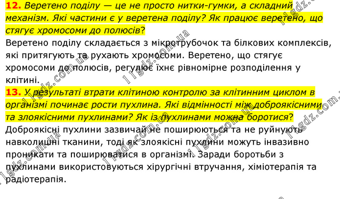 12. Веретено поділу — це не просто нитки-гумки, а складний механізм. Які частини є у веретена поділу? Як працює веретено, що стягує хромосоми до полюсів? Веретено поділу складається з мікротрубочок та білкових комплексів, які притягують та рухають хромосоми. Веретено, що стягує хромосоми до полюсів, регулює їхнє рівномірне розподілення у клітині. 13. У результаті втрати клітиною контролю за клітинним циклом в організмі починає рости пухлина. Які відмінності між доброякісними та злоякісними пухлинами? Як із пухлинами можна боротися? Доброякісні пухлини зазвичай не поширюються та не руйнують навколишні тканини, тоді як злоякісні пухлини можуть інвазивно проникати та поширюватися в організмі. Заради боротьби з пухлинами використовуються хірургічні втручання, хіміотерапія та радіотерапія.