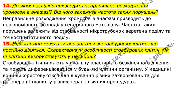 14. До яких наслідків призводить неправильне розходження хромосом в анафазі? Від чого залежить частота таких порушень? Неправильне розходження хромосом в анафазі призводить до нерівномірного розподілу генетичного матеріалу. Частота таких порушень залежить від стабільності мікротрубочок веретена поділу та точності мітотичного поділу. 15. Нові клітини можуть утворюватися зі стовбурових клітин, що постійно діляться. Схарактеризуй особливості стовбурових клітин. Як ці клітини використовують у медицині? Стовбурові клітини мають унікальну властивість безкінечного ділення та можуть диференціюватися у будь-які клітини організму. У медицині вони використовуються для лікування різних захворювань та для регенерації тканин у різних терапевтичних процедурах.