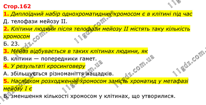 1. Диплоїдний набір однохроматидних хромосом є в клітині під час Д. телофази мейозу ІІ. 2. Клітини людини після телофази мейозу ІІ містять таку кількість хромосом Б. 23. 3. Мейоз відбувається в таких клітинах людини, як В. клітини — попередники гамет. 4. У результаті кросинговеру А. збільшується різноманіття нащадків. 5. Наслідком розходження хромосом замість хроматид у метафазі мейозу І є Б. зменшення кількості хромосом у клітинах, що утворилися.