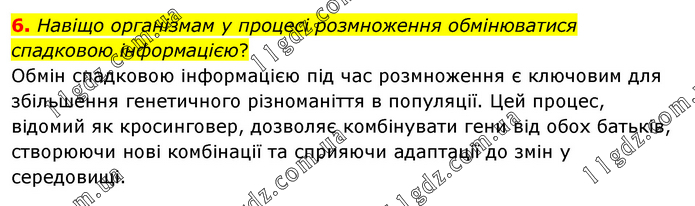 Навіщо організмам у процесі розмноження обмінюватися спадковою інформацією? Обмін спадковою інформацією під час розмноження є ключовим для збільшення генетичного різноманіття в популяції. Цей процес, відомий як кросинговер, дозволяє комбінувати гени від обох батьків, створюючи нові комбінації та сприяючи адаптації до змін у середовищі.