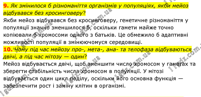 9. Як змінилося б різноманіття організмів у популяціях, якби мейоз відбувався без кросинговеру? Якби мейоз відбувався без кросинговеру, генетичне різноманіття у популяції значно зменшилося б, оскільки гамети майже точно копіювали б хромосоми одного з батьків. Це обмежило б адаптивні можливості популяції в змінюючомуся середовищі. 10. Чому під час мейозу про-, мета-, ана- та телофаза відбуваються двічі, а під час мітозу — один? Мейоз відбувається двічі, щоб зменшити число хромосом у гаметах та зберегти стабільність числа хромосом в популяції. У мітозі відбувається один цикл поділу, оскільки його основна функція — забезпечити рост і заміну клітин в організмі.