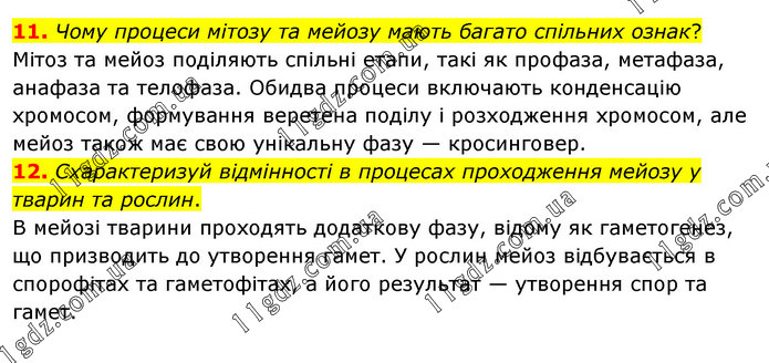 11. Чому процеси мітозу та мейозу мають багато спільних ознак? Мітоз та мейоз поділяють спільні етапи, такі як профаза, метафаза, анафаза та телофаза. Обидва процеси включають конденсацію хромосом, формування веретена поділу і розходження хромосом, але мейоз також має свою унікальну фазу — кросинговер. 12. Схарактеризуй відмінності в процесах проходження мейозу у тварин та рослин. В мейозі тварини проходять додаткову фазу, відому як гаметогенез, що призводить до утворення гамет. У рослин мейоз відбувається в спорофітах та гаметофітах, а його результат — утворення спор та гамет.