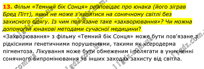Фільм «Темний бік Сонця» розповідає про юнака (його зіграв Бред Пітт), який не може з’являтися на сонячному світлі без захисного одягу. Із чим пов’язане таке «захворювання»? Чи можна допомогти юнакові методами сучасної медицини? «Захворювання» з фільму «Темний бік Сонця» може бути пов'язане з рідкісними генетичними порушеннями, такими як ксеродерма пігментоза. Лікування може бути обмеженим і полягати в уникненні сонячного випромінювання та інших заходах захисту від світла.