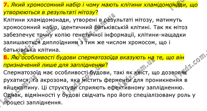 7. Який хромосомний набір і чому мають клітини хламідомонади, що утворюються в результаті мітозу? Клітини хламідомонади, утворені в результаті мітозу, матимуть хромосомний набір, ідентичний батьківській клітині. Так як мітоз забезпечує точну копію генетичної інформації, клітини-нащадки залишаються диплоїдними з тим же числом хромосом, що і батьківська клітина. 8. Які особливості будови сперматозоїда вказують на те, що він призначений лише для запліднення? Сперматозоїд має особливості будови, такі як хвіст, що дозволяє рухатися, та акрозома, яка містить ферменти для проникнення в яйцеклітину. Ці структури сприяють ефективному заплідненню. Однак, відмінності у будові свідчать про його спеціалізовану роль у процесі запліднення.