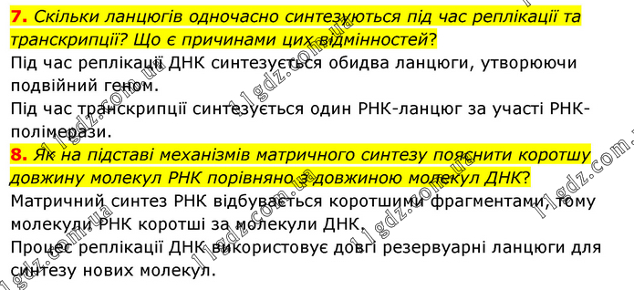 7. Скільки ланцюгів одночасно синтезуються під час реплікації та транскрипції? Що є причинами цих відмінностей? Під час реплікації ДНК синтезується обидва ланцюги, утворюючи подвійний геном. Під час транскрипції синтезується один РНК-ланцюг за участі РНК-полімерази. 8. Як на підставі механізмів матричного синтезу пояснити коротшу довжину молекул РНК порівняно з довжиною молекул ДНК? Матричний синтез РНК відбувається коротшими фрагментами, тому молекули РНК коротші за молекули ДНК. Процес реплікації ДНК використовує довгі резервуарні ланцюги для синтезу нових молекул.