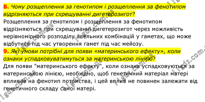 8. Чому розщеплення за генотипом і розщеплення за фенотипом відрізняються при схрещуванні дигетерозигот? Розщеплення за генотипом і розщеплення за фенотипом відрізняються при схрещуванні дигетерозигот через можливість нерівномірного розподілу алельних комбінацій у гаметах, що може відбутися під час утворення гамет під час мейозу. 9. Які умови потрібні для появи «материнського ефекту», коли ознаки успадковуватимуться за материнською лінією? Для появи "материнського ефекту", коли ознаки успадковуються за материнською лінією, необхідно, щоб генетичний матеріал матері впливав на фенотип потомства, і цей вплив не повинен залежати від генетичного складу самої матері.
