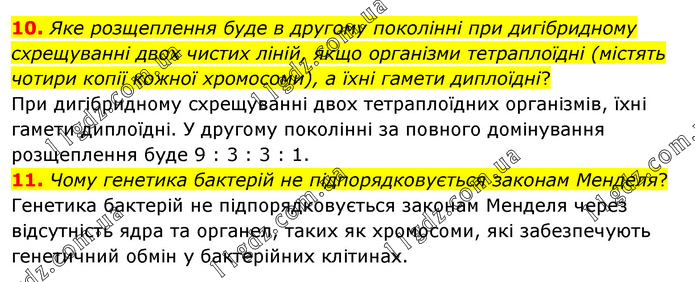 10. Яке розщеплення буде в другому поколінні при дигібридному схрещуванні двох чистих ліній, якщо організми тетраплоїдні (містять чотири копії кожної хромосоми), а їхні гамети диплоїдні? При дигібридному схрещуванні двох тетраплоїдних організмів, їхні гамети диплоїдні. У другому поколінні за повного домінування розщеплення буде 9 : 3 : 3 : 1. 11. Чому генетика бактерій не підпорядковується законам Менделя? Генетика бактерій не підпорядковується законам Менделя через відсутність ядра та органел, таких як хромосоми, які забезпечують генетичний обмін у бактерійних клітинах.