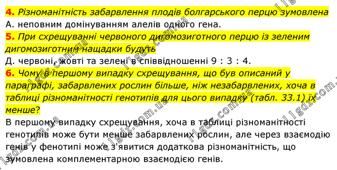 4. Різноманітність забарвлення плодів болгарського перцю зумовлена А. неповним домінуванням алелів одного гена. 5. При схрещуванні червоного дигомозиготного перцю із зеленим дигомозиготним нащадки будуть Д. червоні, жовті та зелені в співвідношенні 9 : 3 : 4. 6. Чому в першому випадку схрещування, що був описаний у параграфі, забарвлених рослин більше, ніж незабарвлених, хоча в таблиці різноманітності генотипів для цього випадку (табл. 33.1) їх менше? В першому випадку схрещування, хоча в таблиці різноманітності генотипів може бути менше забарвлених рослин, але через взаємодію генів у фенотипі може з'явитися додаткова різноманітність, що зумовлена комплементарною взаємодією генів.