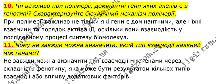 10. Чи важливо при полімерії, домінантні гени яких алелів є в генотипі? Схарактеризуйте біохімічний механізм полімерії. При полімерії важливо не тільки які гени є домінантними, але і їхні взаємини та порядок активації, оскільки вони взаємодіють у послідовному процесі синтезу біомолекул. 11. Чому не завжди можна визначити, який тип взаємодії наявний між генами? Не завжди можна визначити тип взаємодії між генами через складність фенотипу, яка може бути результатом кількох типів взаємодії або впливу додаткових факторів.