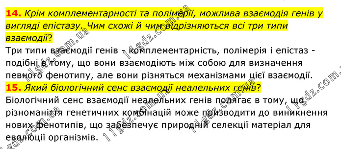 14. Крім комплементарності та полімерії, можлива взаємодія генів у вигляді епістазу. Чим схожі й чим відрізняються всі три типи взаємодії? Три типи взаємодії генів - комплементарність, полімерія і епістаз - подібні в тому, що вони взаємодіють між собою для визначення певного фенотипу, але вони різняться механізмами цієї взаємодії. 15. Який біологічний сенс взаємодії неалельних генів? Біологічний сенс взаємодії неалельних генів полягає в тому, що різноманіття генетичних комбінацій може призводити до виникнення нових фенотипів, що забезпечує природній селекції матеріал для еволюції організмів.