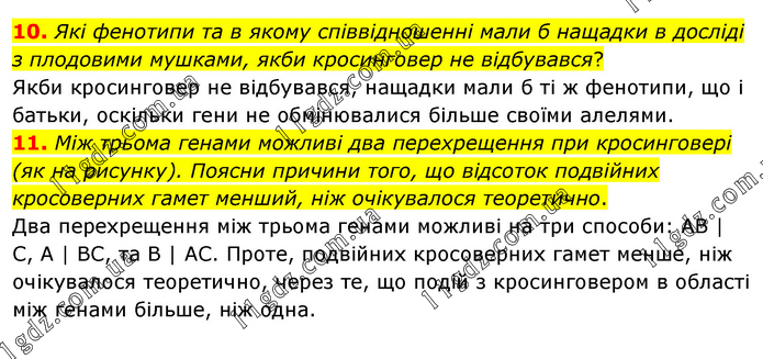 10. Які фенотипи та в якому співвідношенні мали б нащадки в досліді з плодовими мушками, якби кросинговер не відбувався? Якби кросинговер не відбувався, нащадки мали б ті ж фенотипи, що і батьки, оскільки гени не обмінювалися більше своїми алелями. 11. Між трьома генами можливі два перехрещення при кросинговері (як на рисунку). Поясни причини того, що відсоток подвійних кросоверних гамет менший, ніж очікувалося теоретично. Два перехрещення між трьома генами можливі на три способи: AB | C, A | BC, та B | AC. Проте, подвійних кросоверних гамет менше, ніж очікувалося теоретично, через те, що подій з кросинговером в області між генами більше, ніж одна.